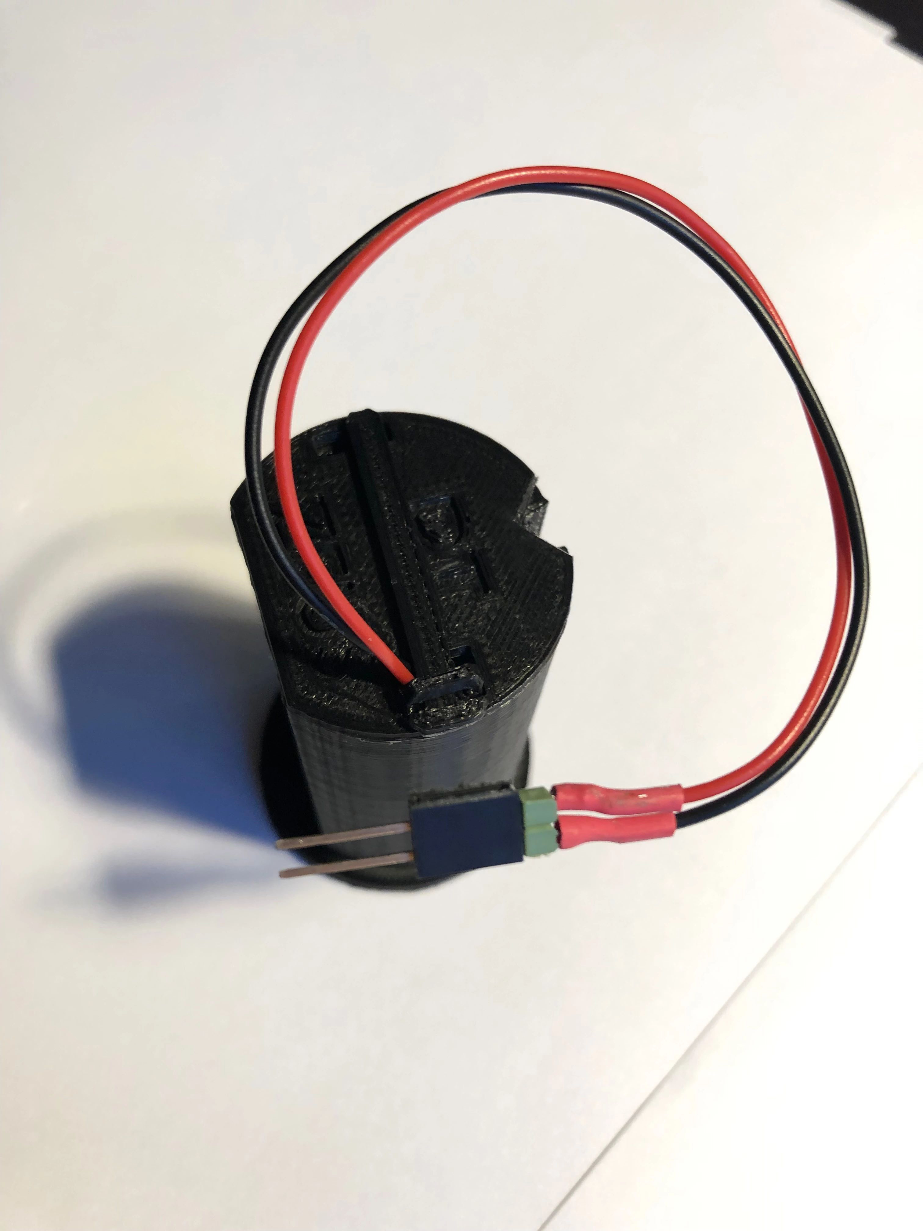- Das Batteriefach wurde durch unseren Schul-3D-Drucker gedruckt. Die Kontakte wurden aus einer nicht verwendeten Alarmanlage genommen und hier eingebaut. Es wurde dann mit dem Transformator und dem ersten Schalter verknüpft.