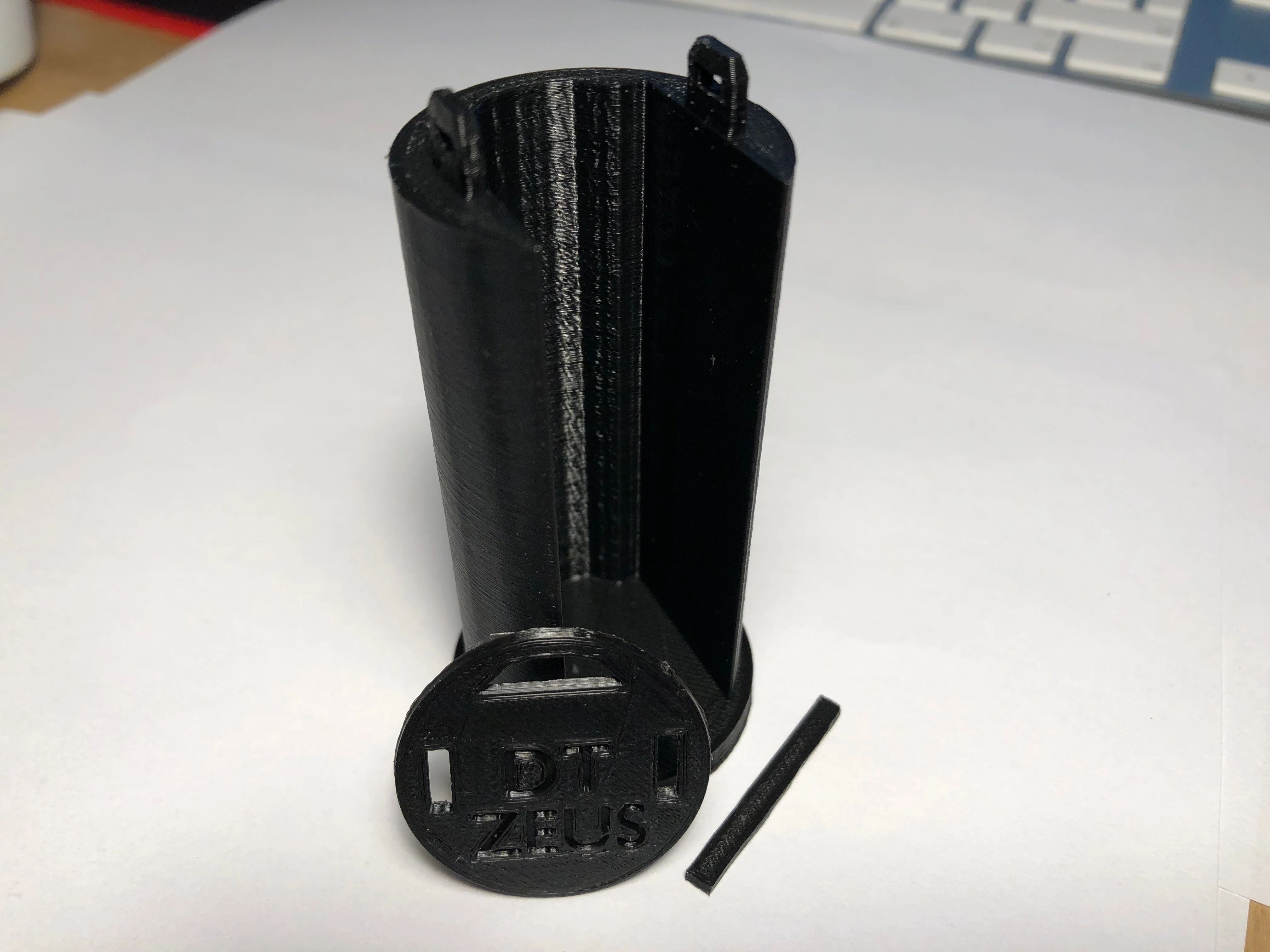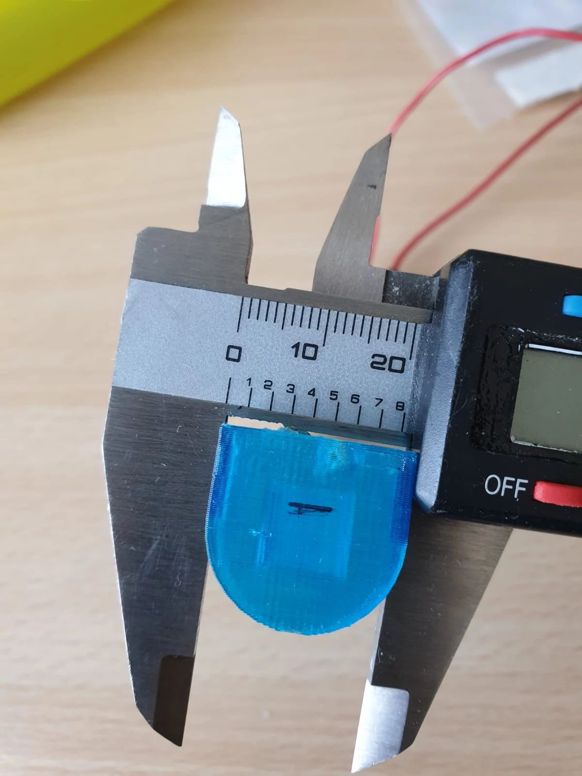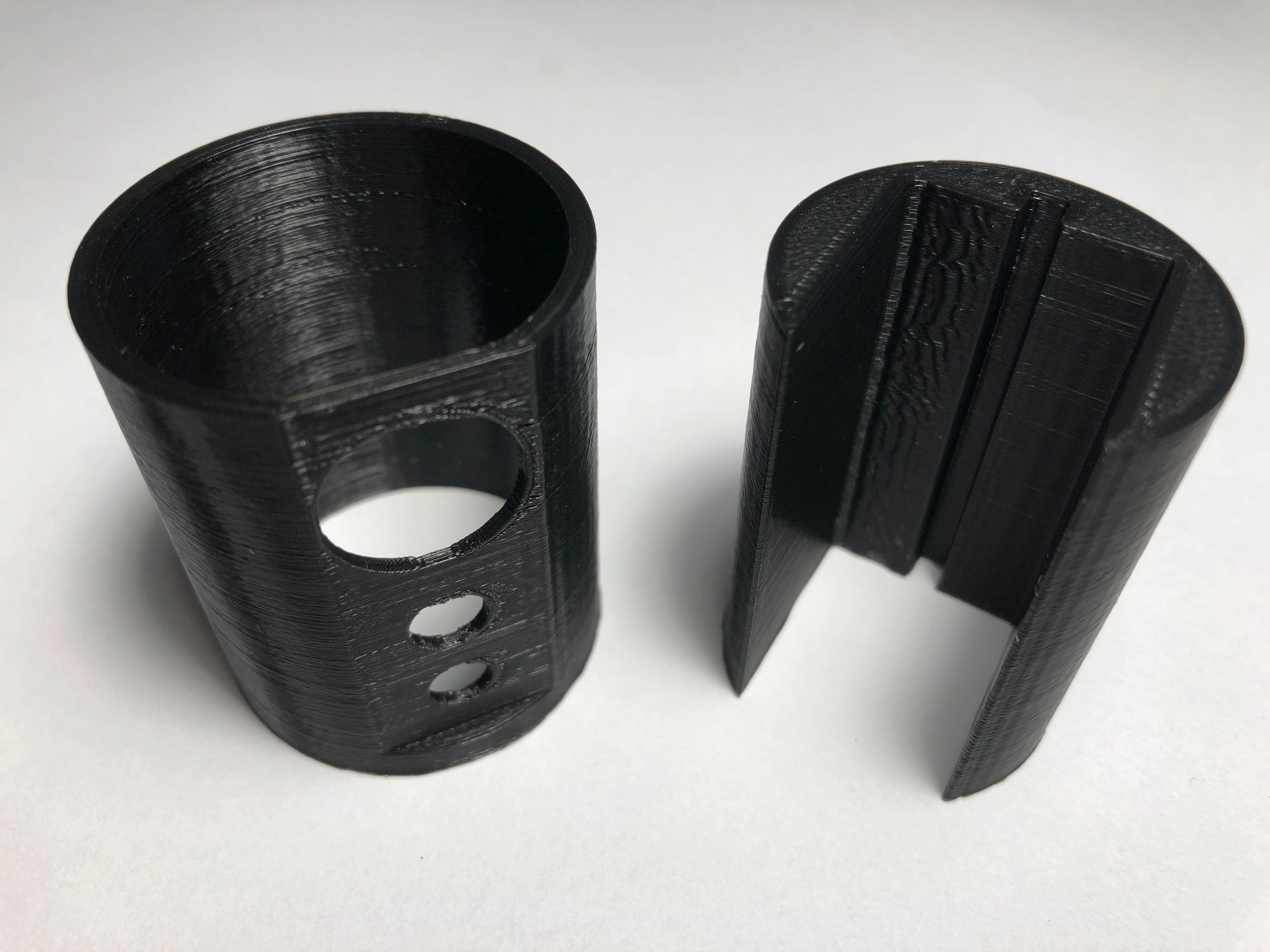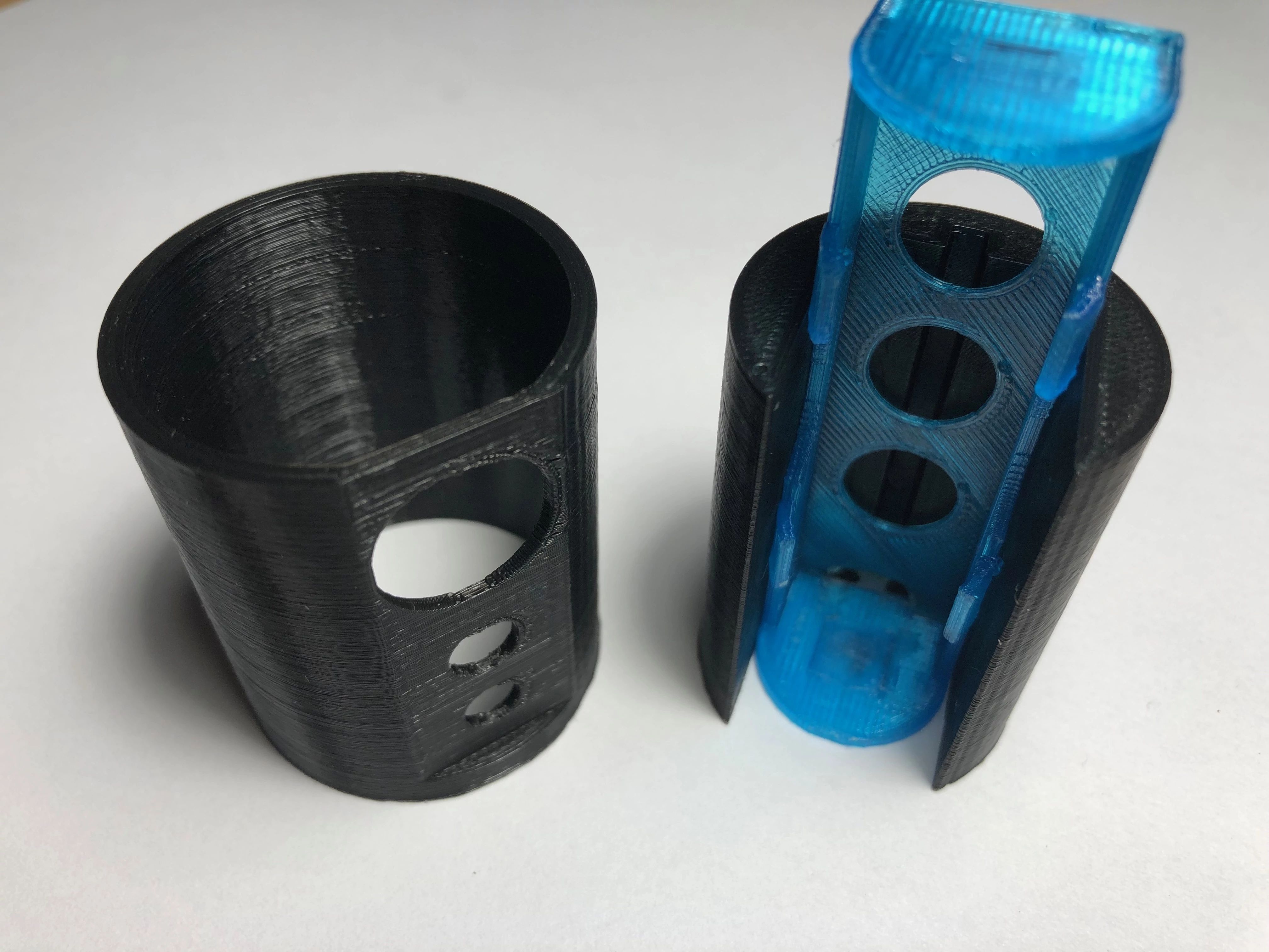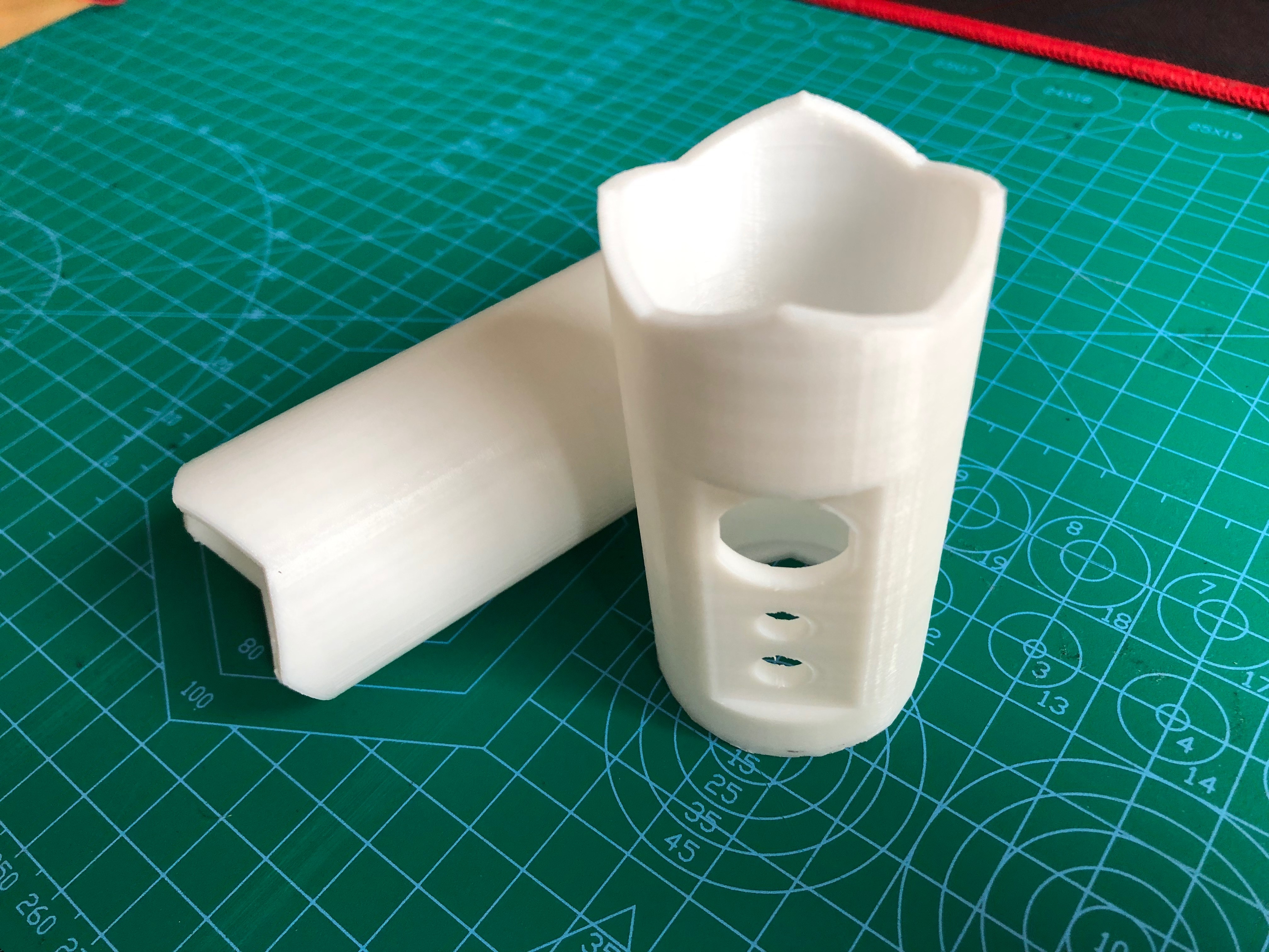 Die Teile sind sehr gut gedruckt worden und haben einige Schwachstellen des Designs aufgezeigt. Das Innenteil des zweiten Druckes ist ein bisschen zu klein für das Batteriefach und der Knopf ist einen Millimeter zu groß. Die Material-Stärke von 2 Millimetern war sehr gut geeignet.