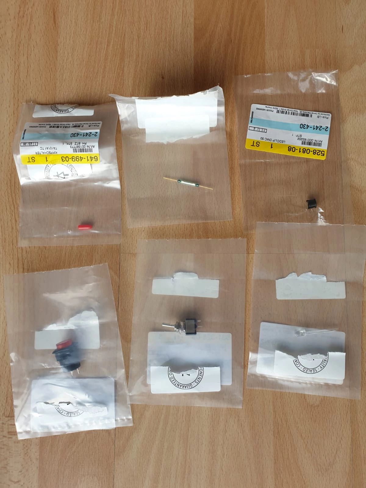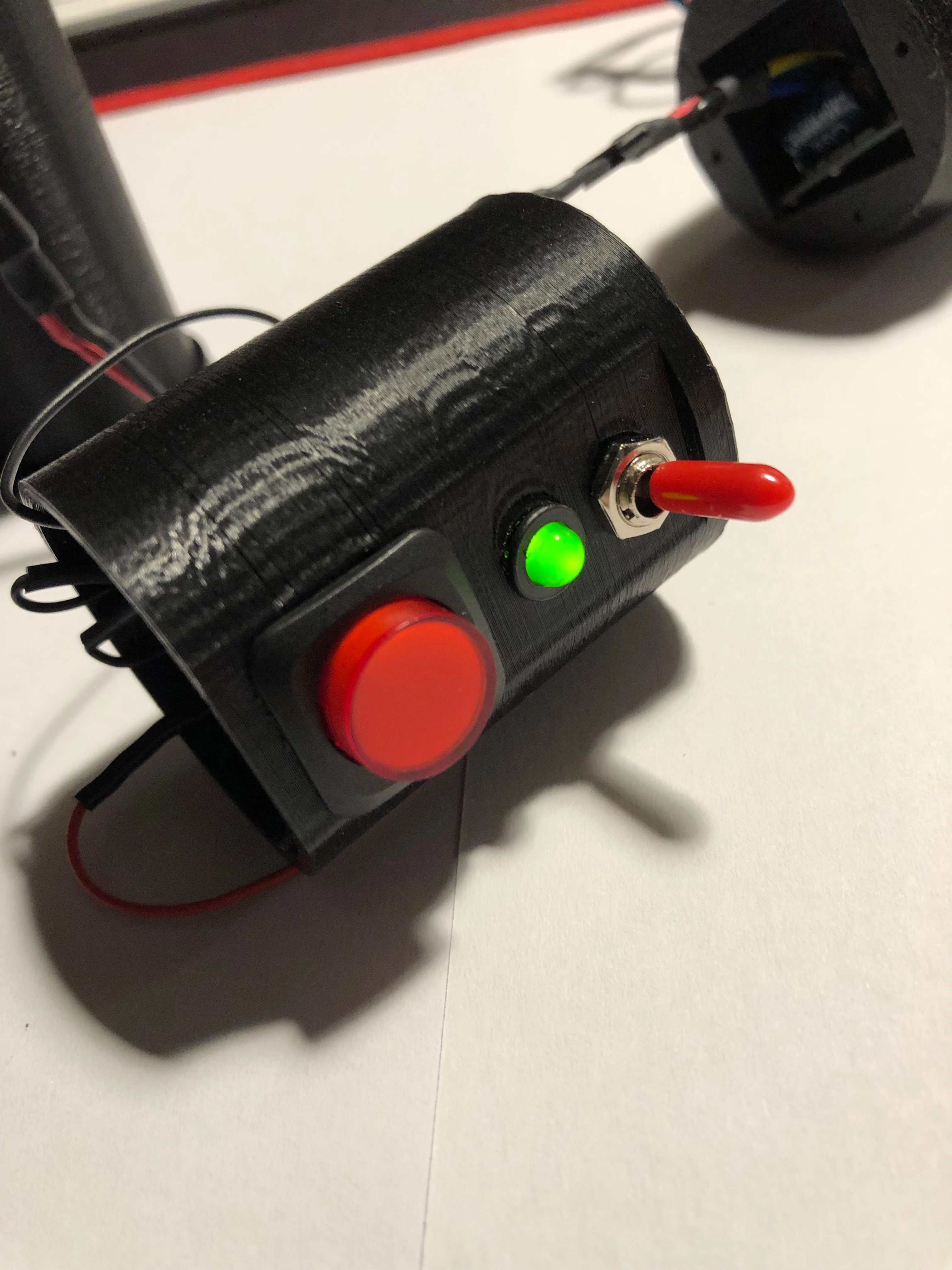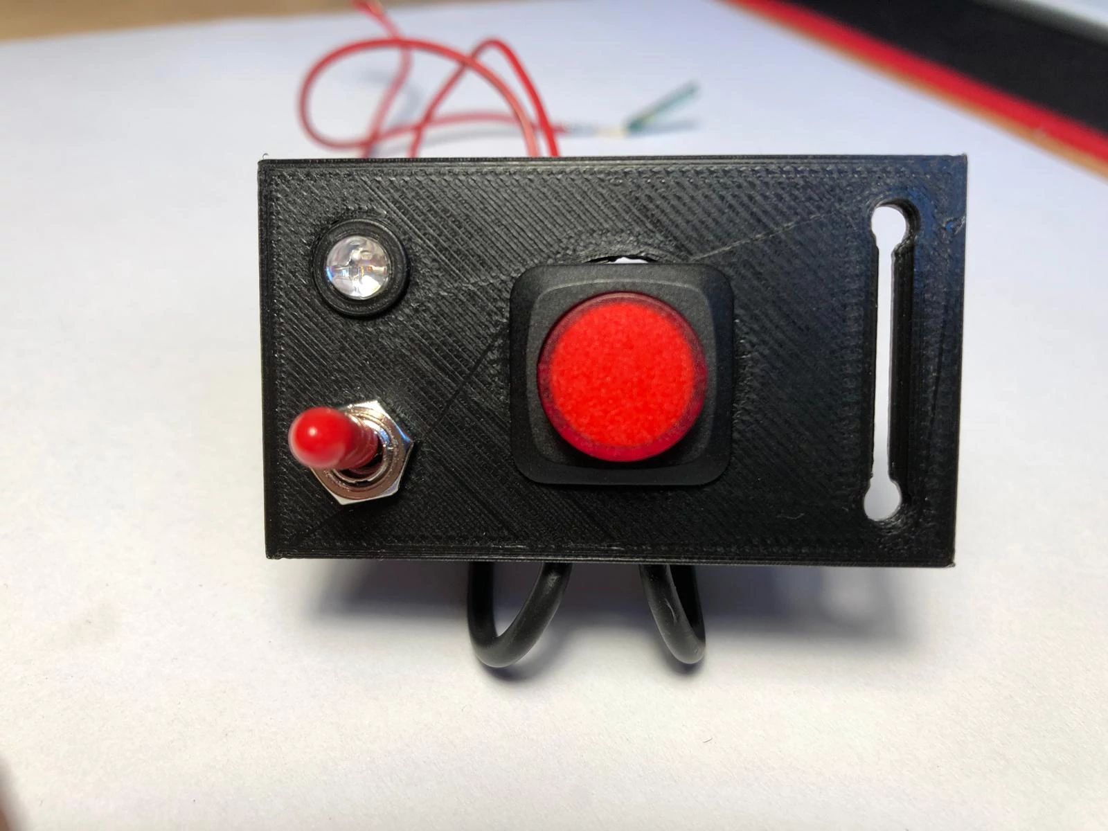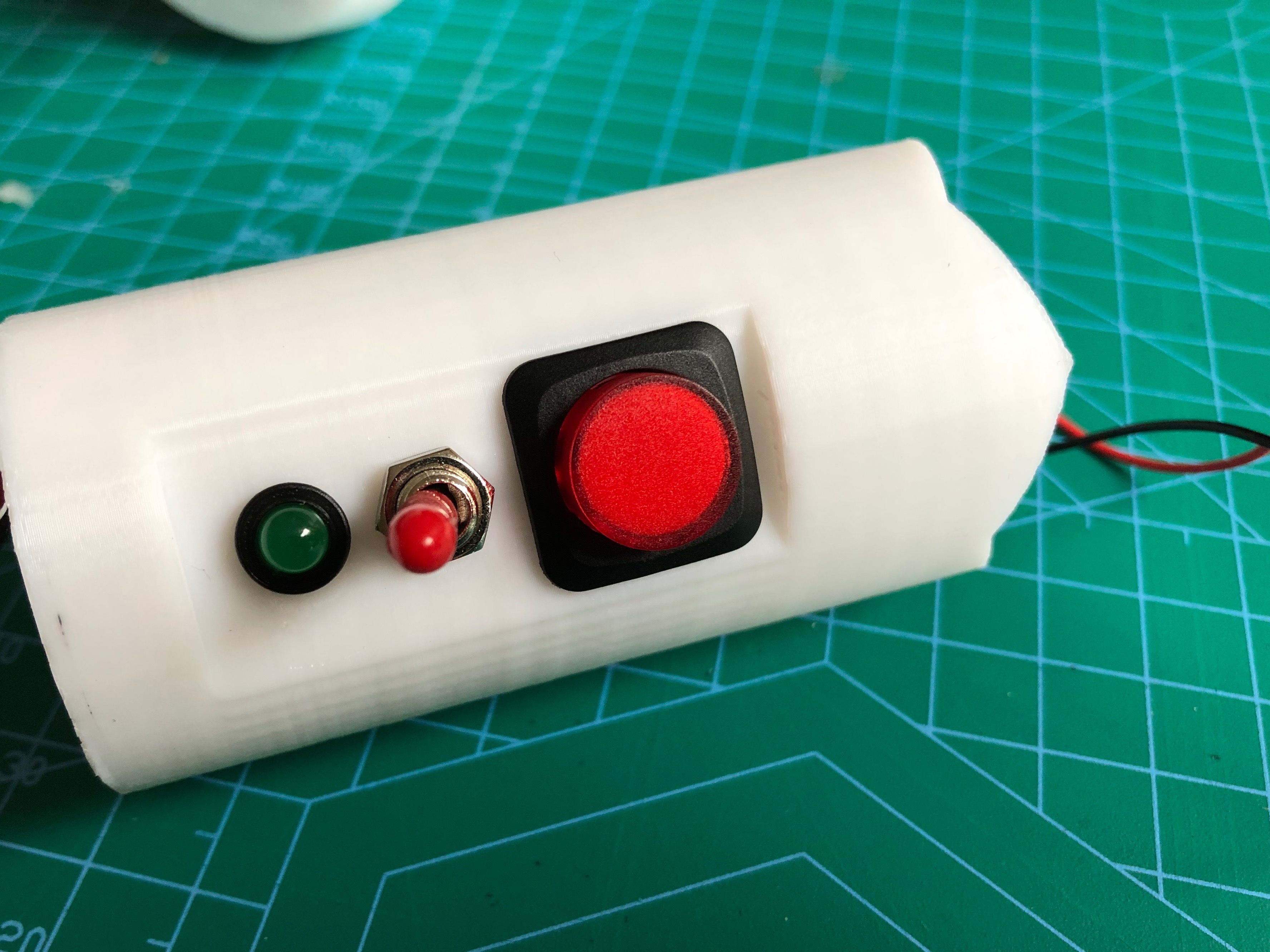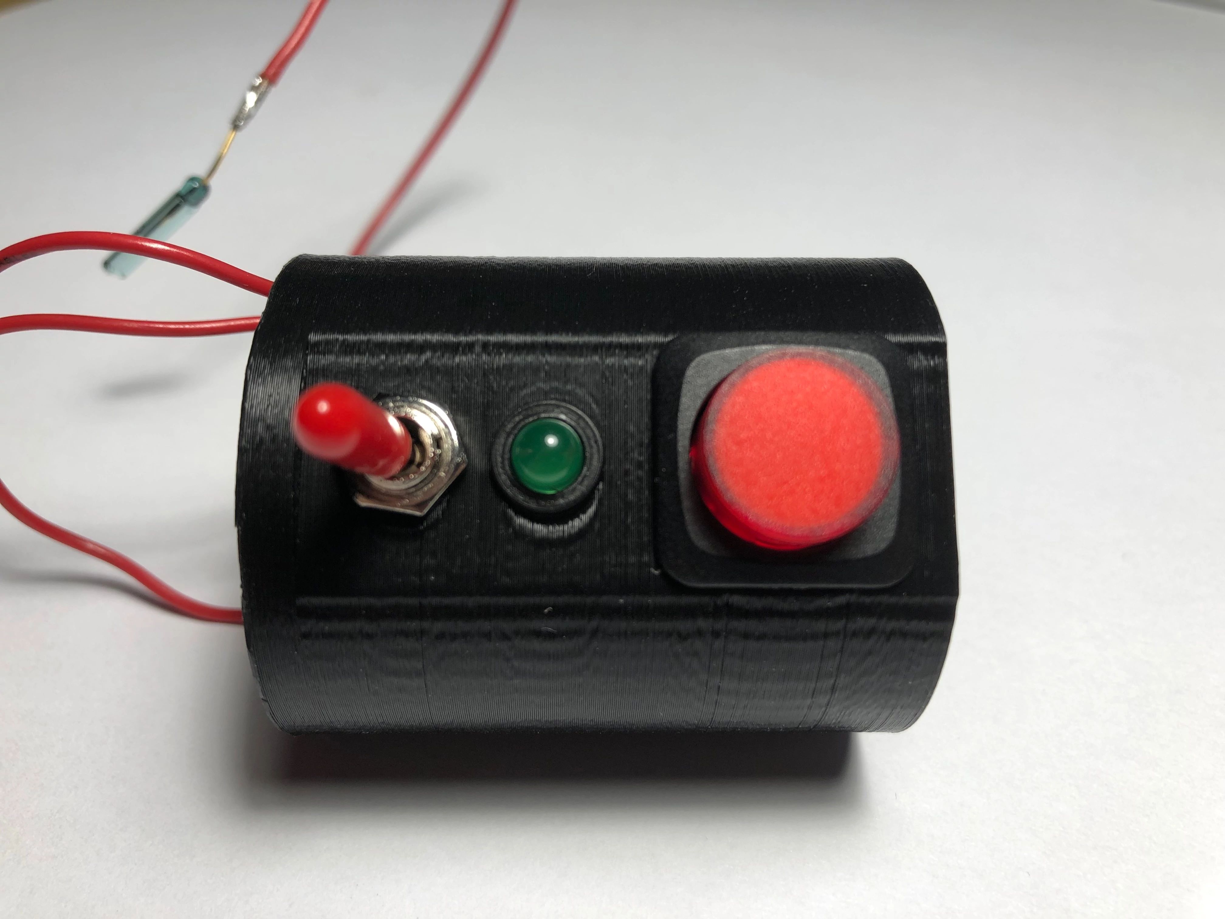 - Ein roter Drucktaster ohne Beleuchtung, welcher als manueller Auslöser für unser Gerät dient. Er muss via Löt-Pins an den Schaltkreis angeschlossen werden.