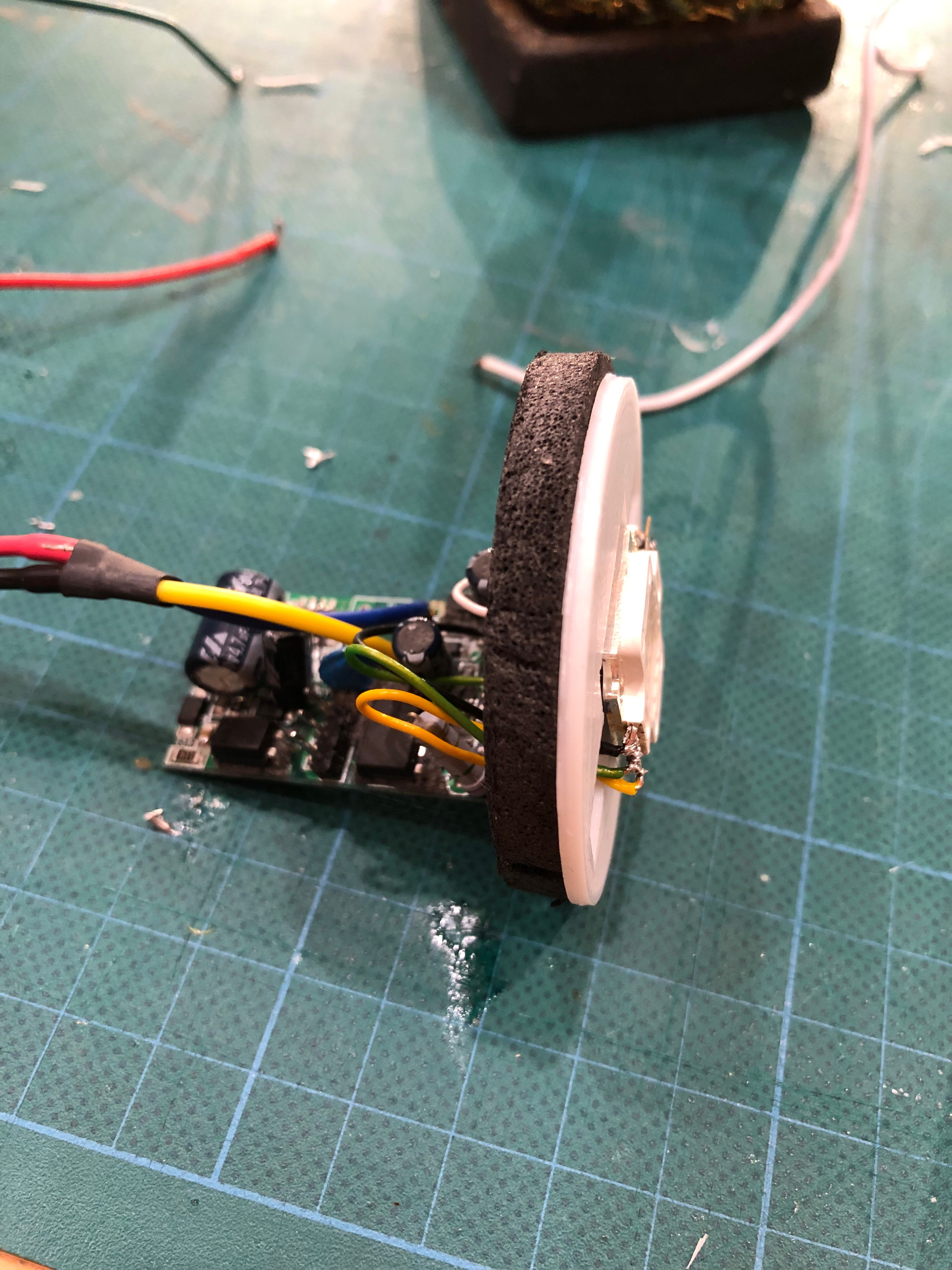 Hinter die LED kam etwas Schaumstoff. Er soll den Abstand zum oberen Rand erweitern und gegen Klappern wirken. Darüber kam der Deckel.