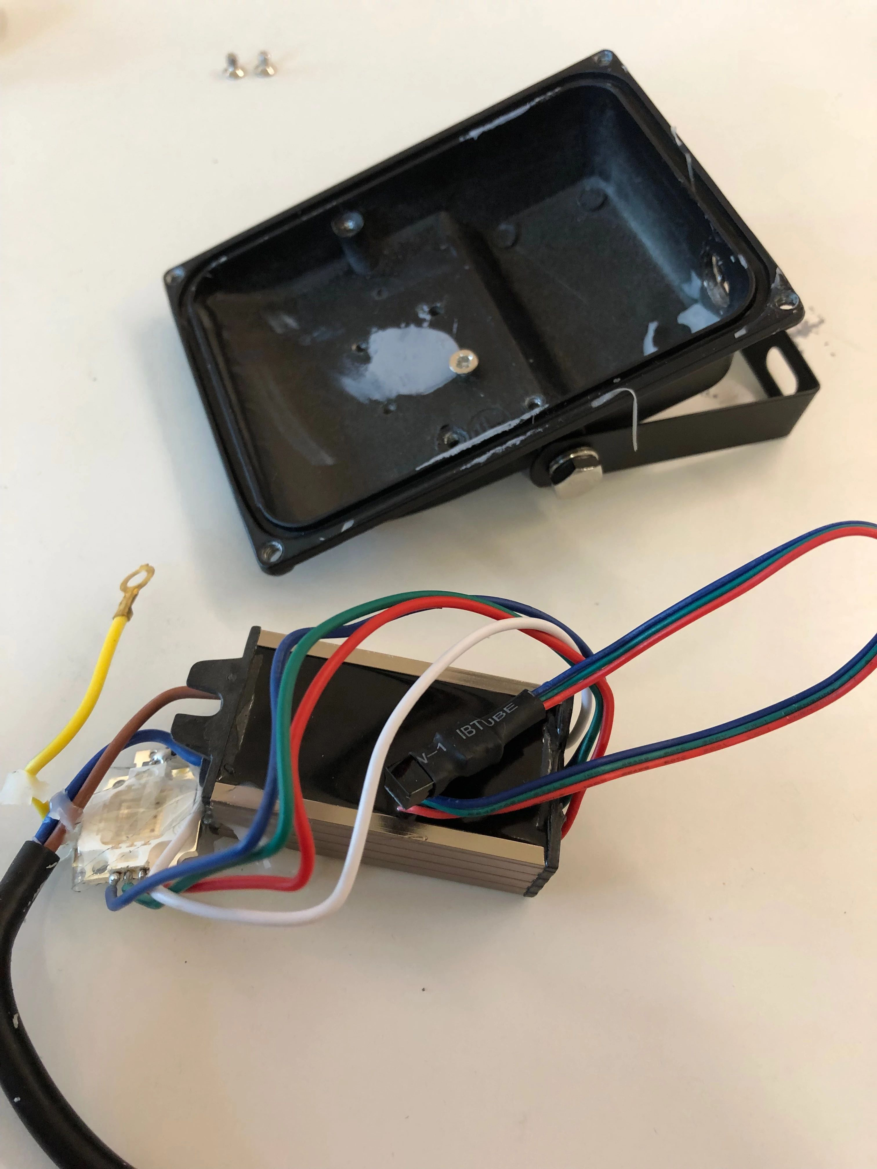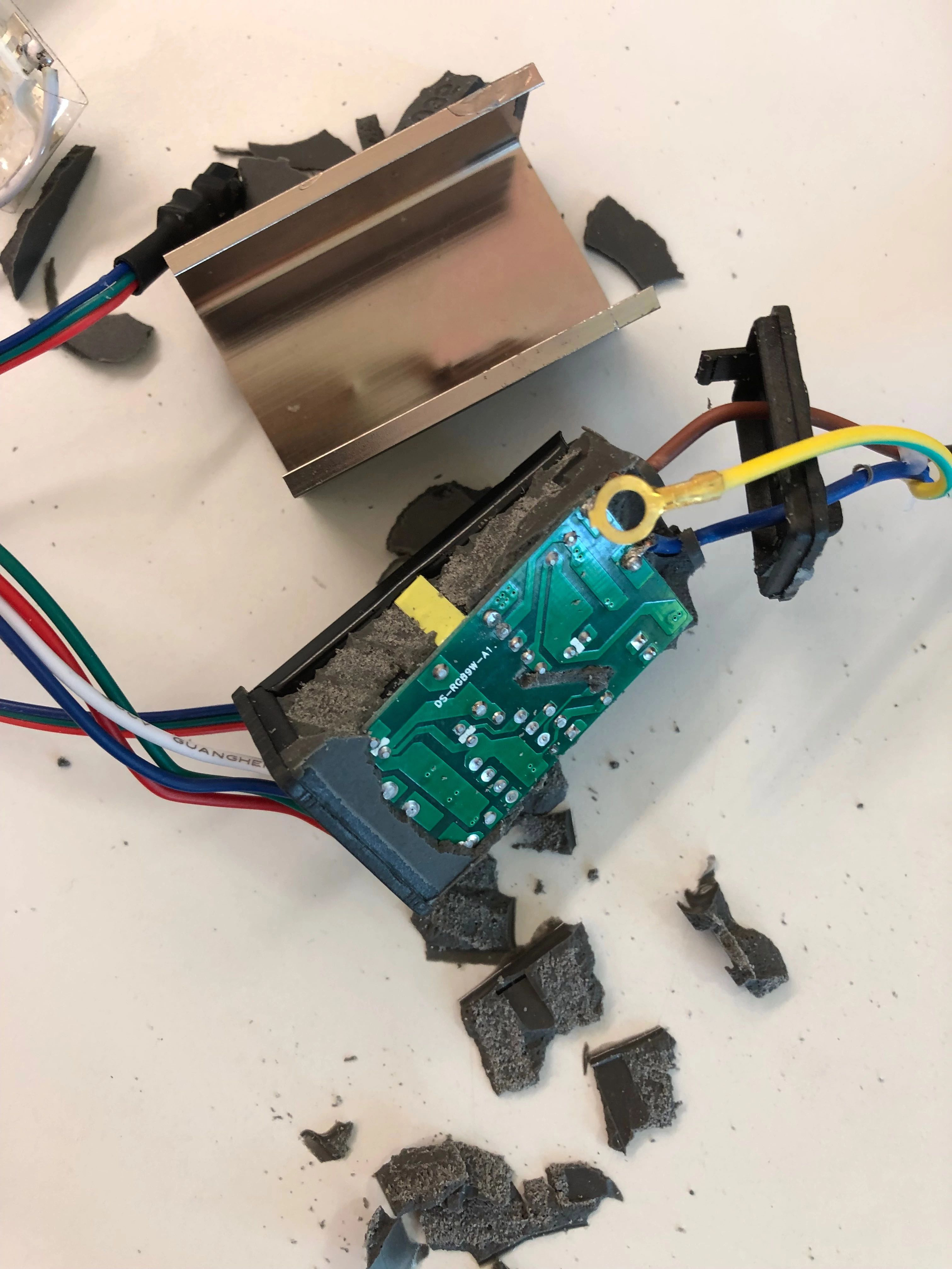 Wir schraubten den kleinen Scheinwerfer auf und entfernten die Elektronikteile. Der Scheinwerfer wird direkt in die Steckdose gesteckt. Das heißt, dass er mit 230 Volt Netzspannung betrieben wird. Das kann unser 18650 Akku erstaunlicherweise nicht liefern. Also haben wir als nächstes gemessen, mit wie vielen Volt die LED betrieben wird. Um gleich an alle relevanten Bauteile zu gelangen, mussten wir allerdings zunächst die Füllung auf der Platine entfernen.