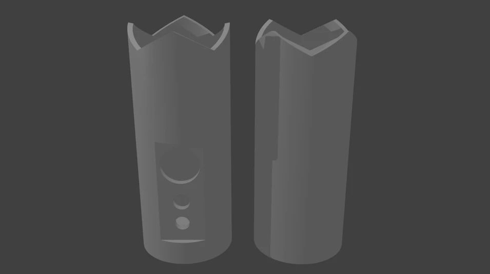 Da der Körper für den 3D-Drucker zu groß war, trennten wir das 3D Model in zwei Hälften. Das machten wir mit einem Zickzack Muster, damit die Teile später perfekt aufeinander sitzen. Im oberen Teil befinden sich alle Ausschnitte und obendrauf eine Kappe mit vier kleinen Löchern und einem quadratischen Ausschnitt. Die vier Löcher waren dafür gedacht, um Schrauben durch den Kopf in den Körper zu schrauben und somit den nötigen Halt zu gewährleisten. Der rechteckige Ausschnitt sorgt dafür, dass die Platine im Kopf nicht in den Körper rutscht, aber alle Kabel durchpassen.
