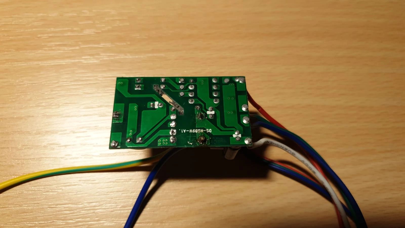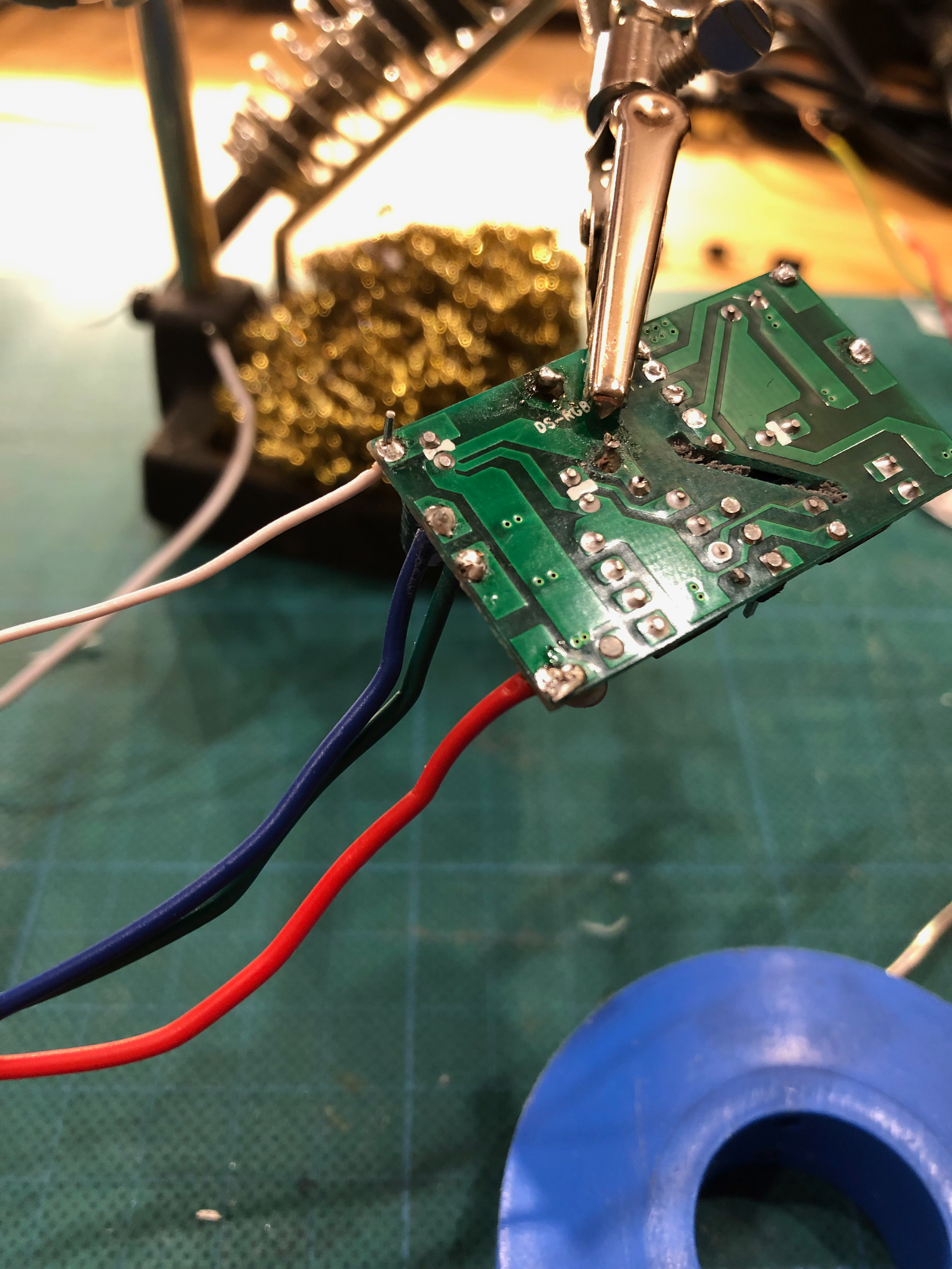 Die Eingangsspannung war natürlich 230V, da der Scheinwerfer kein zusätzliches Netzteil besitzt, und die LED wurde mit 9V betrieben. Wir lokalisierten als Nächstes den Transformator und entfernten ihn von der Platine und an seine Stelle kamen zwei Kabel.