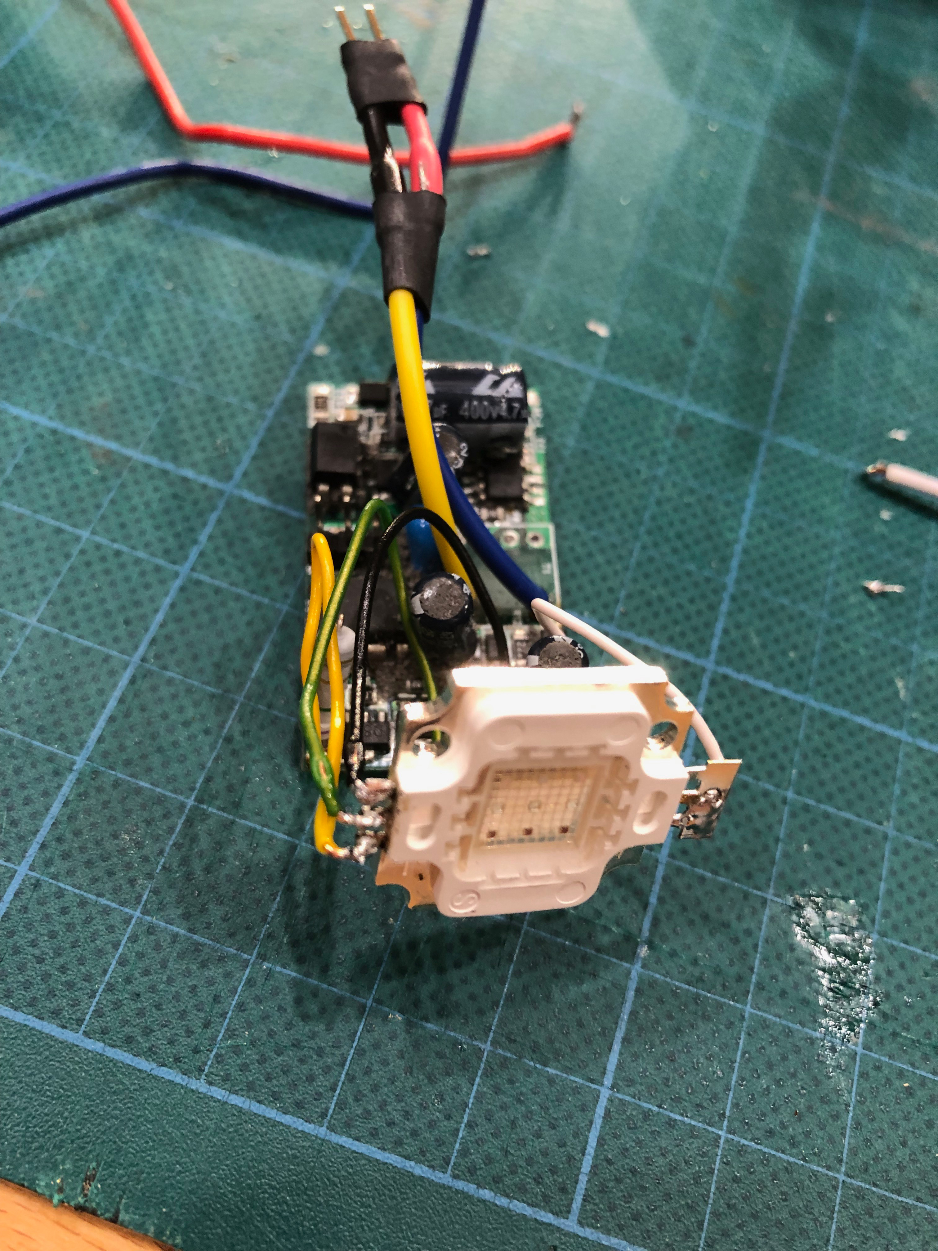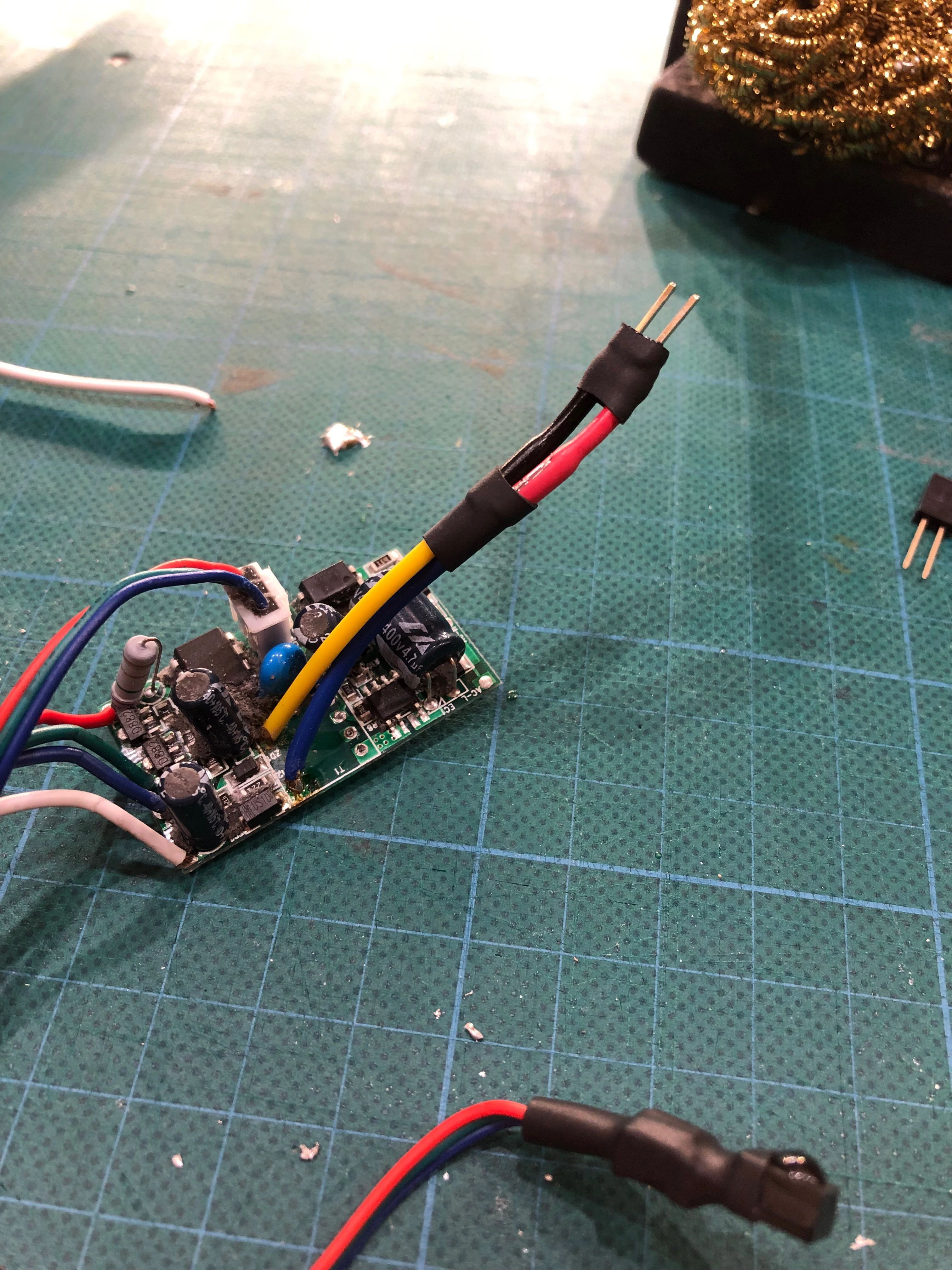 Damit die LED in den Kopf passt, müssen die Kabel gekürzt werden. Hierfür löteten wir einfach alle Kabel ab und löteten vier neue, kürzere Kabel an die alten Stellen.