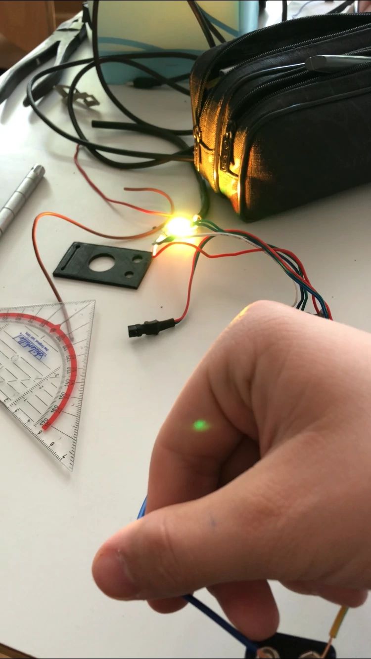 Da die LED mit höchstens drei Volt und 20mA betrieben werden kann, war die 9-Volt Spannungsquelle natürlich zu stark. Also bauten wir einen Vorwiderstand vor der LED ein. Mithilfe eines Online-Vorwiderstandsrechner, bestimmten wir den kleinst-nötigen Widerstand. Nachdem wir diesen herausgefunden haben, entschieden wir uns vorsichtshalber doch für einen 500 Ohm Widerstand.
