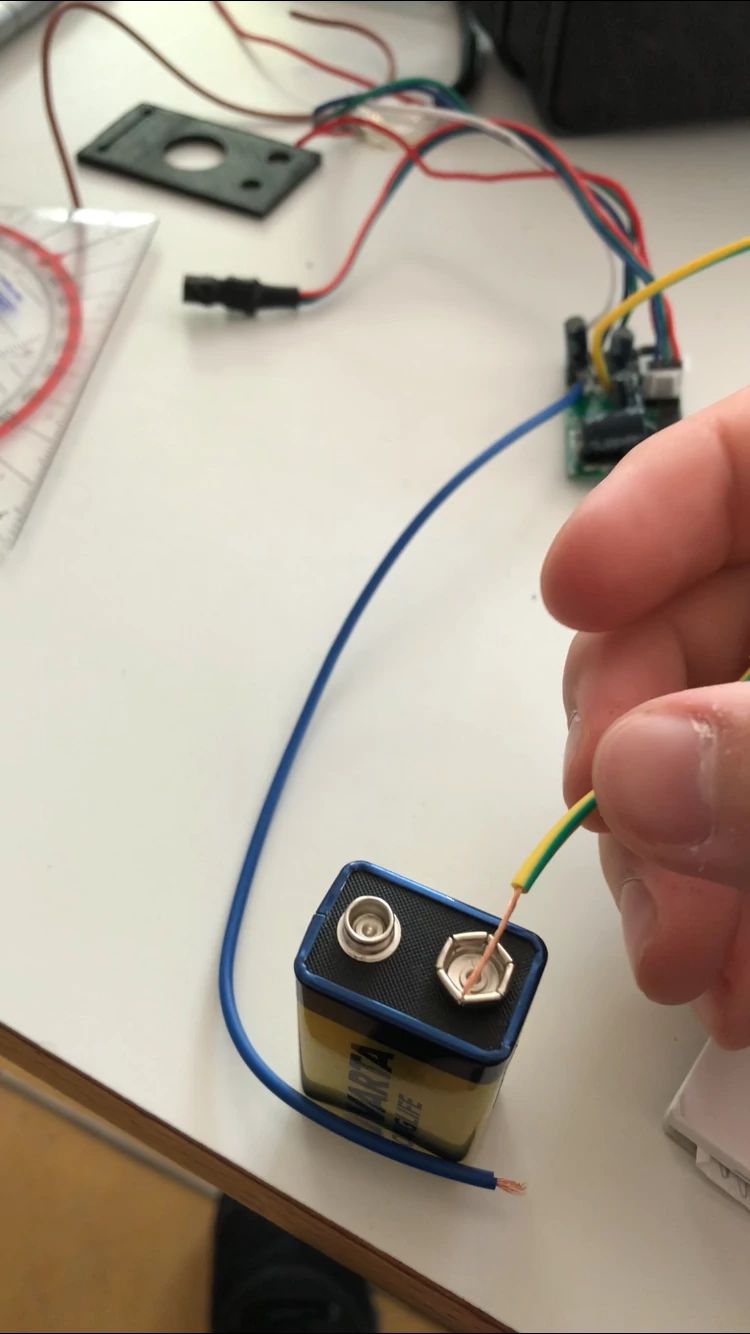 An die Kabel legten wir einen 9 Volt Block an, um zu testen, ob noch alles funktioniert.